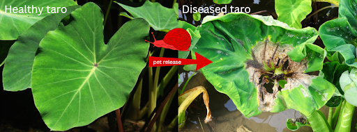 The apple snail (Pomacea canaliculata) is a freshwater pest commonly found in slow-moving water bodies including rice and taro fields, ponds, ditches, wetlands, and streams. Native to South America, its spread is believed to have occurred through the aquarium industry. These snails damage taro crops by chewing through the corms, creating entry points for pathogens, which severely reduce crop yield and quality. They also consume young taro shoots. In natural ecosystems, apple snails disrupt habitats by eating plants essential for native fish and birds. Additionally, they are vectors for rat lungworm and other parasitic diseases, posing significant risks to both human health and agriculture in Hawaiʻi and beyond.