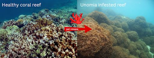 Unomia stolonifera is a soft-octocoral native to the Indo-Pacific that has devastated coastal ecosystems in Venezuela since its introduction in the 90’s. First discovered in Pearl Harbor in 2019, it poses a significant threat to Hawaii’s coral reefs. This species is popular in the aquarium trade and is believed to have been introduced to Pearl Harbor through an aquarium release. This soft coral is capable of overgrowing and smothering native stony corals, decimating fish populations, and releasing a foul, fishy scent across the coastline. Unomia is a prime example of why it is important to dispose of unwanted pets responsibly through an amnesty program and never introduce non-native species to the environment.