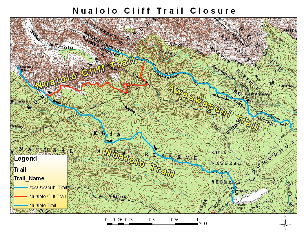 LIHUE — Effective May 9, the Department of Land and Natural Resources (DLNR) will close for an indefinite period the 2.1 mile long Nualolo Cliff hiking trail in the Na Pali-Kona Forest Reserve on the north-west coast of Kauai. The trail closure is due to unsafe trail conditions including washed out and eroded trail near the 1.5 and 1.75 mile markers. The trail tread is only six inches wide in some places.