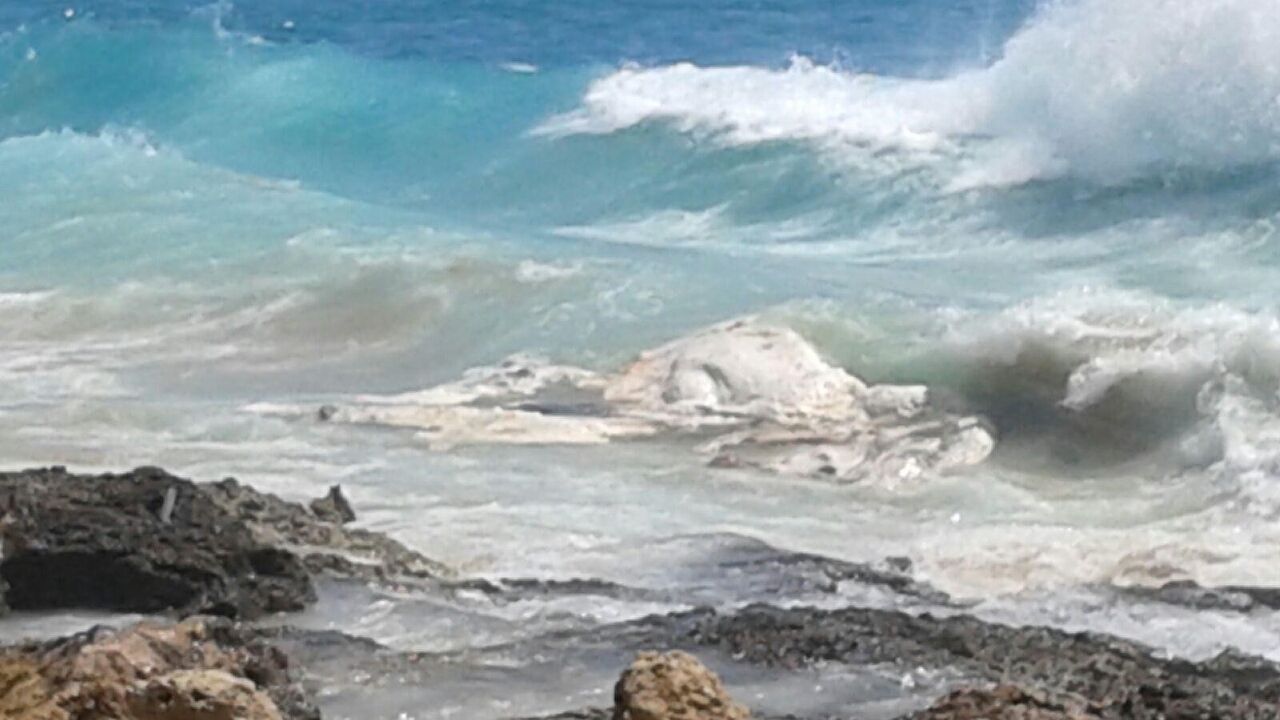 NANAKULI, O‘AHU — Following the arrival on shore this afternoon about 2 p.m. of a 25’ section of decomposed sperm whale at Nanakuli Beach Park, the Department of Land and Natural Resources (DLNR) is currently looking at extraction options to remove the carcass. The challenge will be getting to the whale. It is now located along a rocky shore that is not easily reached by land. Access by sea is hampered by current high surf conditions which have closed Nanakuli Beach Park. DLNR enforcement officers are observing the ocean currents and wind conditions, anticipating further movement down the beach where it might be reached and brought to shore for removal. Timing and method of removal will be determined by the soonest possible accessible conditions. Monitoring will continue tomorrow. The public is advised to remain out of the nearshore ocean waters until further notice, as sharks have been sighted.
