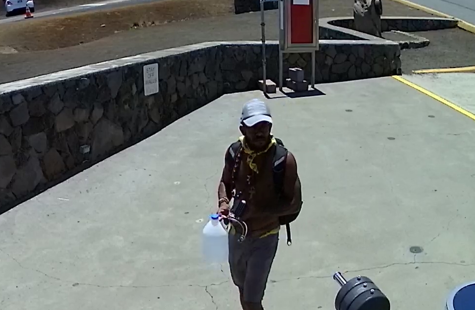 Photos taken by a Hale Pohaku Visitor Center security camera show a shirtless man carrying a plastic gallon container and walking uphill along the road. A telescope worker confirmed that this was the person they witnessed on the road at about the time the rocks were placed.