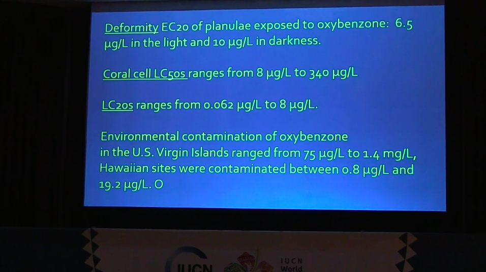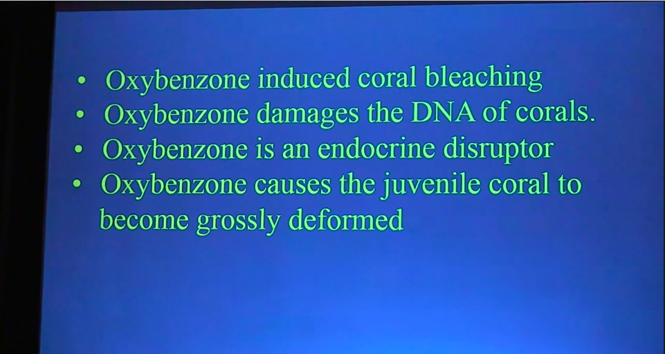 Recent studies have shown that oxybenzone causes deformities in coral larvae (planulae), making them unable to swim, settle out,