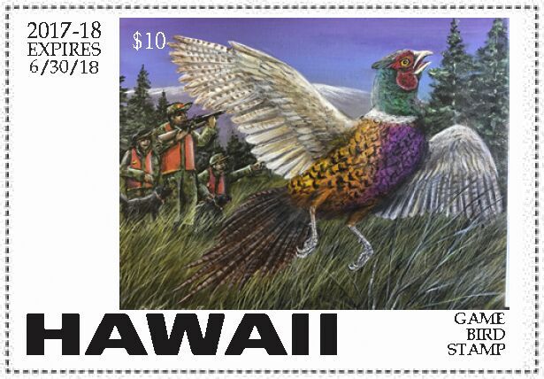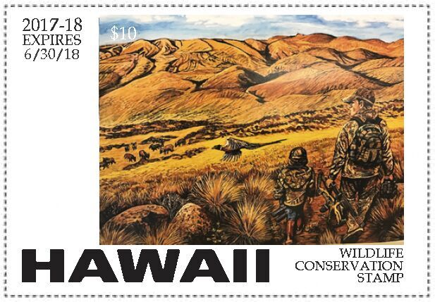 The conservation stamp is required on the Hawai‘i State hunting license, and the game bird hunting stamp is required for those intending to hunt game birds. Both stamps (differing slightly in text) will be available to wildlife stamp collectors by calling (808) 587-0166 or visit the Division of Forestry and Wildlife office located at 1151 Punchbowl Street, Room 325 Honolulu, HI 96813