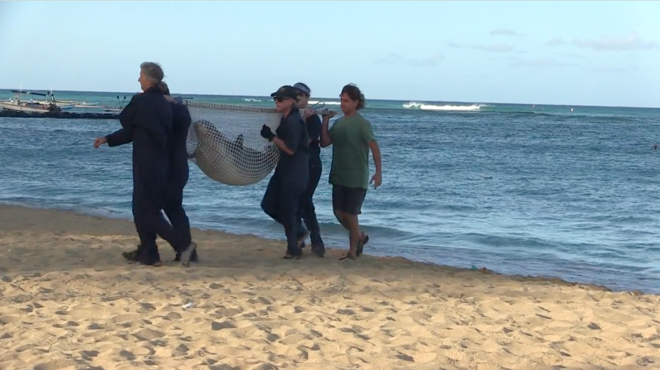 Using a net stretcher, a team of experts scooped Kaimana off the beach and carried her up to a truck, where she was loaded into a cage for transport to an undisclosed location. Experts had decided that given the large numbers of people on various Waikiki beaches and in the water, for both public and the seals safety it was best to move Kaimana to a more remote location. Earlier in the week, at a news conference they explained that young, impressionable and curious pups, interacting with humans, could develop behavioral traits that later in life can create problems.