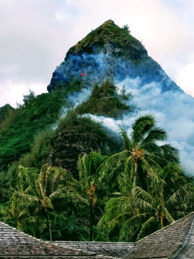 The fire, first reported early this morning, is burning on the middle ridge between the Ha‘ena State Park boundary and Limahuli valley. According to fire supervisors from the DLNR Division of Forestry and Wildlife (DOFAW), the fire is burning mostly on a very steep ridge, is not advancing much, and is still a few ridges away from the Kalalau trail. At this time it is not threatening to move near to or across the trail. Firefighting efforts are currently focused on the Limahuli side of the fire. There are two helicopters making water drops on the flames, including the Kaua‘i Fire Department’s Air 1 chopper and a DOFAW contract helicopter. Additionally two engines and firefighters from DOFAW are on the scene. Two DOFAW staff are on the trail to warn hikers to stay put. The trail is under the jurisdiction of the DLNR Division of State Parks, which is working out a more formal notification system should it be needed.