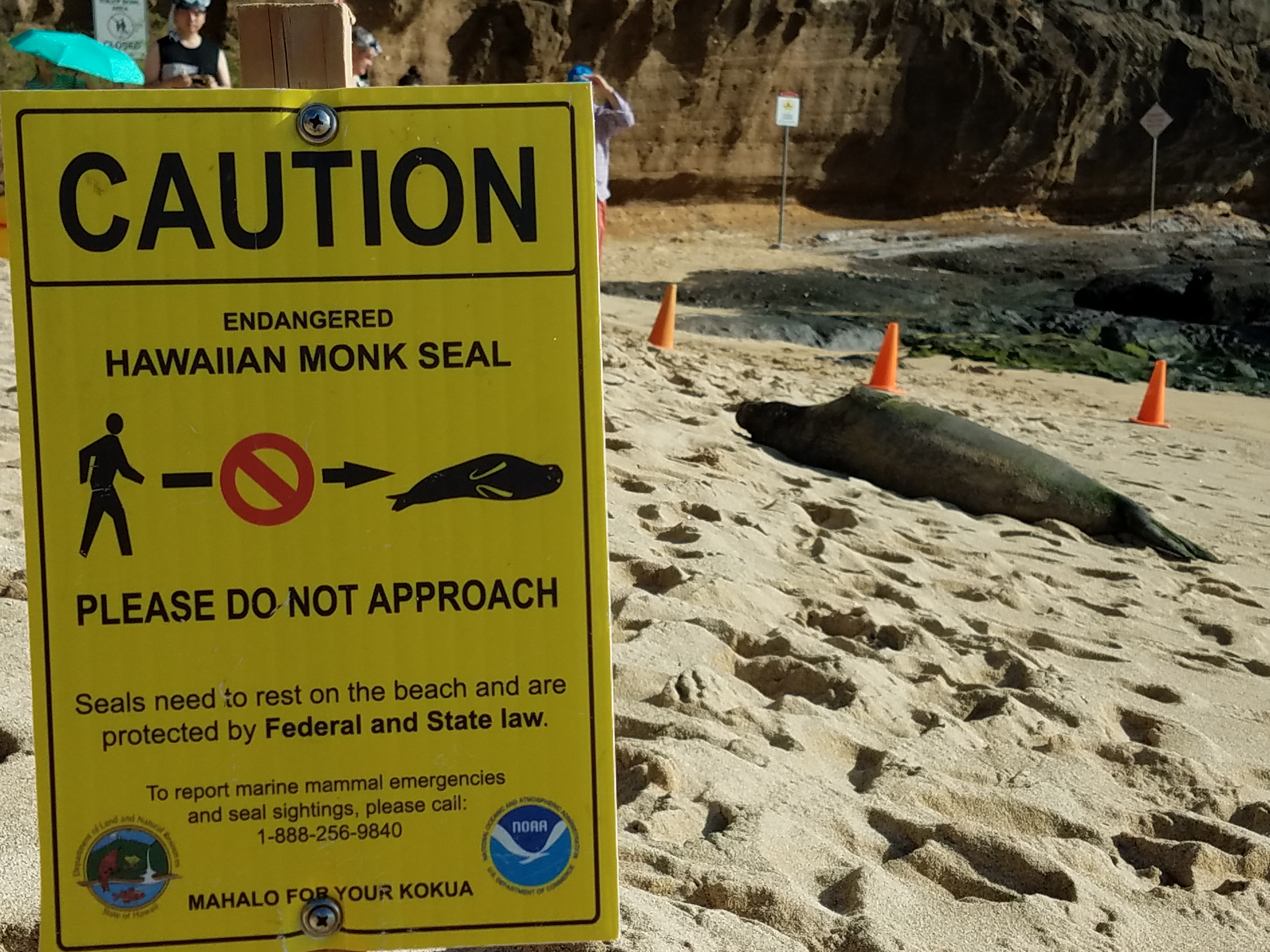 Seals “haul-out” at Hanauma Bay regularly, but typically up onto the rocky tidal shelves on either side of the popular snorkeling destination. Swimmers report the seal was swimming parallel to the beach prior to it hauling out on the sand on the left side of the beach at about 6:50 a.m. DLNR Chair Suzanne Case and DLNR Division of Aquatic Resources Administrator Dr. Bruce Anderson happened to be at the bay for a tour and helped set up cones around the resting seal to keep curious people and photographers back. HMAR staff and volunteers arrived a little later and set up caution signs. Shortly after nine the seal went back into the water and was last seen swimming back toward the open ocean.