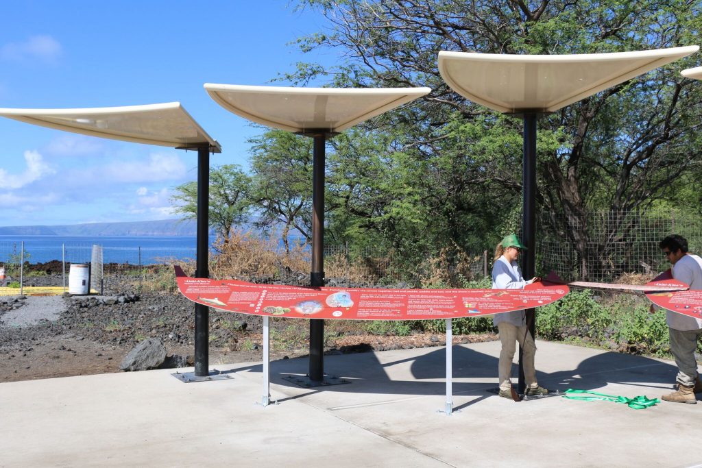 NAR staff is asking everyone, residents as well as visitors, to paddle together, to protect its resources each time they visit. They hope the central idea, that caring for a place is everyone’s responsibility, comes through loud and clear with the new outdoor information kiosk. This is why the information panels are in the shapes of two wa‘a, or canoes, and the shade structures overhead are in the shapes of canoe sails.