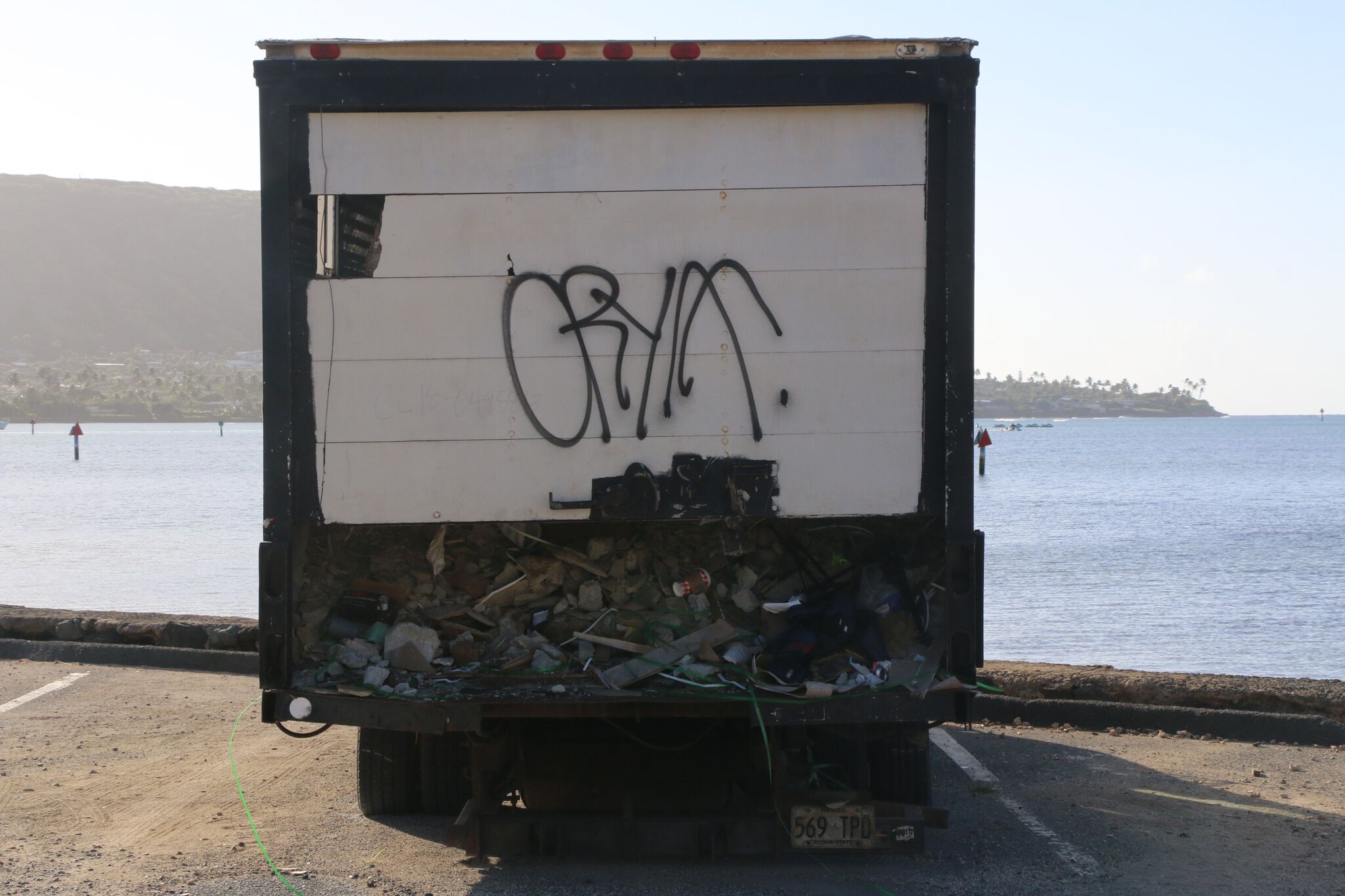 (Honolulu) – A large panel van, full of hundreds of pounds of construction debris was towed from alongside the coastline at east O‘ahu’s Maunalua Bay this afternoon. The truck sporting graffiti, broken windows, and flat tires was apparently towed to the bay’s parking lot several months ago and abandoned. The DLNR Division of Boating and Ocean Recreation (DOBOR) posted the truck as abandoned on Oct. 31st and that triggered notification to the last registered owner who did not respond to multiple parking tickets, certified letters, a notice posted on the truck’s windshield or attempts to track her down.