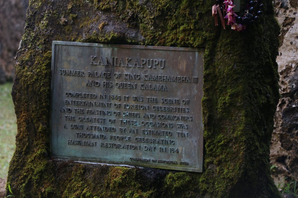 Kaniakapūpū, while promoted on some social media and tourism websites, has long been closed to visitation due to its cultural significance, as the second most important native Hawaiian structure on O‘ahu; second only to Iolani Palace. Beginning in 1845 King Kamehameha III and Queen Kalama hosted visiting dignitaries and large parties at the summer palace, including a Hawaiian Restoration Day luau in 1847, said to be attended by ten thousand guests.