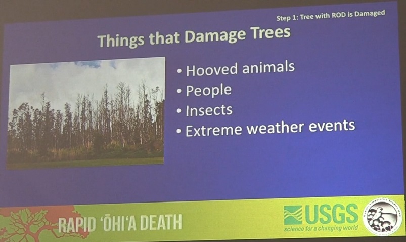 (Kona, Hawai‘i) – The people leading research and management of the fungal disease known as Rapid ʻŌhiʻa Death revealed their latest scientific findings and management tools to interested people at a community forum at the West Hawai‘i Civic Center on Saturday.  Billed as a Rapid ʻŌhiʻa Death Symposium, the seminar was the second of two held this year on Hawai‘i island which has seen hundreds of thousands of acres of native ʻōhiʻa forest impacted by the fungal disease. Among the revelations a couple of dozen participants heard, reinforced the notion that keeping hooved animals (ungulates) like cows, goats, sheep, and pigs out of forests helps them stay healthy.
