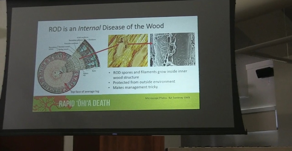 In this video Dr. Lisa Keith, a USDA researcher presents findings from Dr. Marc Hughes of the University of Hawaii on the latest scientific information on how to treat wood and trees that have Rapid Ohia Death to keep the fungal disease in check and from spreading to other wood or trees in the forest. This presentation is from a community forum on Rapid Ohia Death held at the West Hawaii Civic Center in Kona on March 30, 2019.