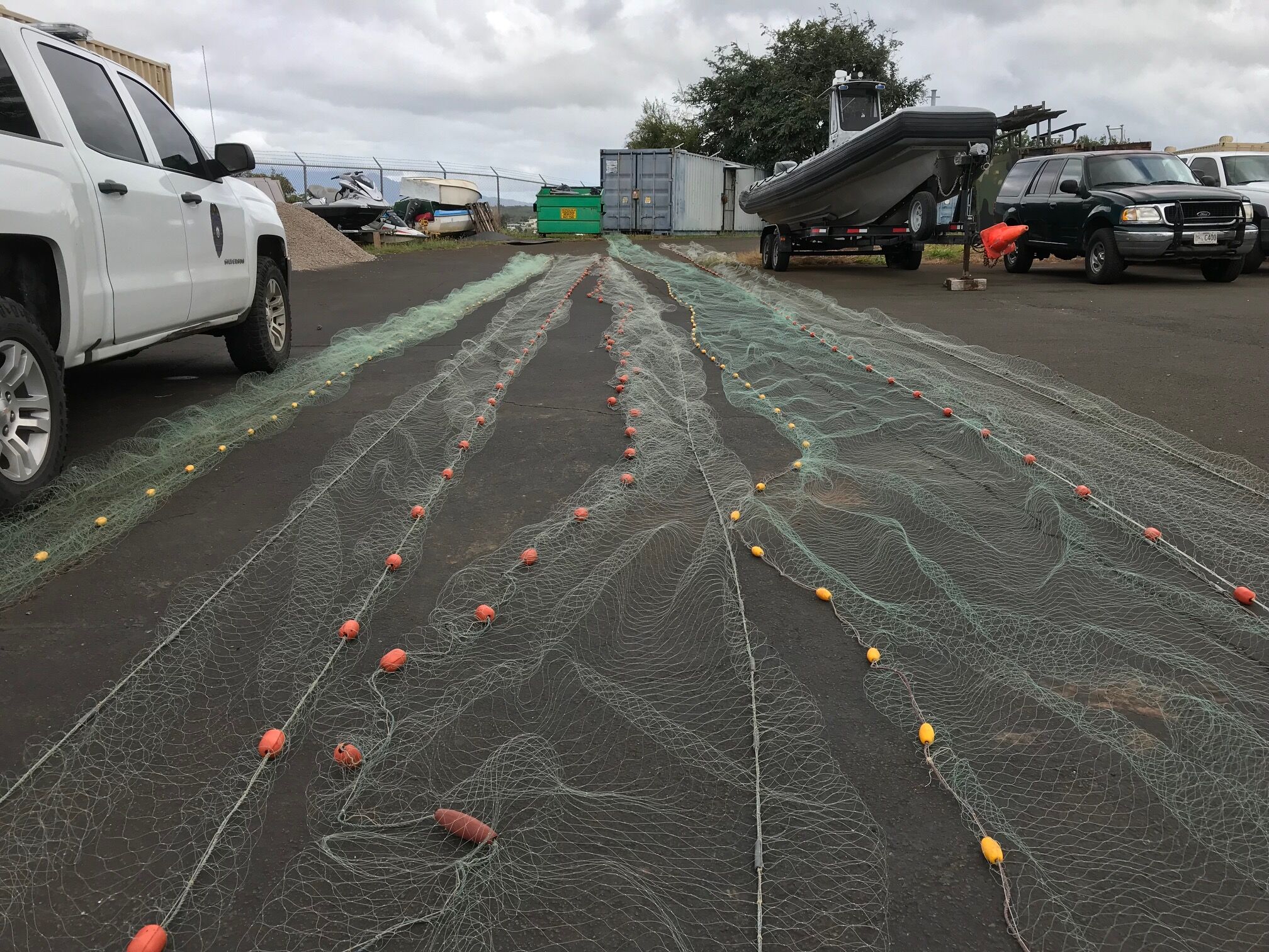 (Honolulu) – Nearly one thousand feet of suspected illegal lay net was confiscated by officers from the DLNR Division of Conservation and Resources Enforcement (DOCARE) this morning. This, after a DOCARE officer on routine patrol on the shoreline adjacent to the La Mariana Sailing Club Restaurant on Sand Island, spotted a man tending several large bags at about 6:30.The officer suspected the bags were filled with what appeared to be lay nets.