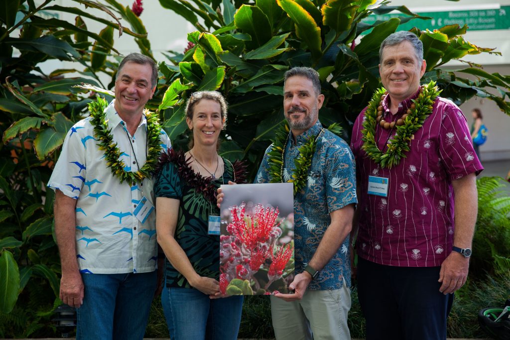 (Honolulu)-The Rapid ʻŌhiʻa Death Working Group, formed to respond to a new disease threatening Hawai‘i’s most important native forest tree, recently received the Conservation Innovation award at the 2019 Hawaii Conservation Conference. The working group is made up of nearly 200 individuals representing state, county, federal, university, non-profit organizations, local and private businesses, as well as private citizens. The purpose of the Rapid ʻŌhiʻa Death Working Group is to facilitate inclusive communication on all issues related to the fungal disease and share knowledge on a regular basis among group members, their organizations, and the people of Hawai’i.