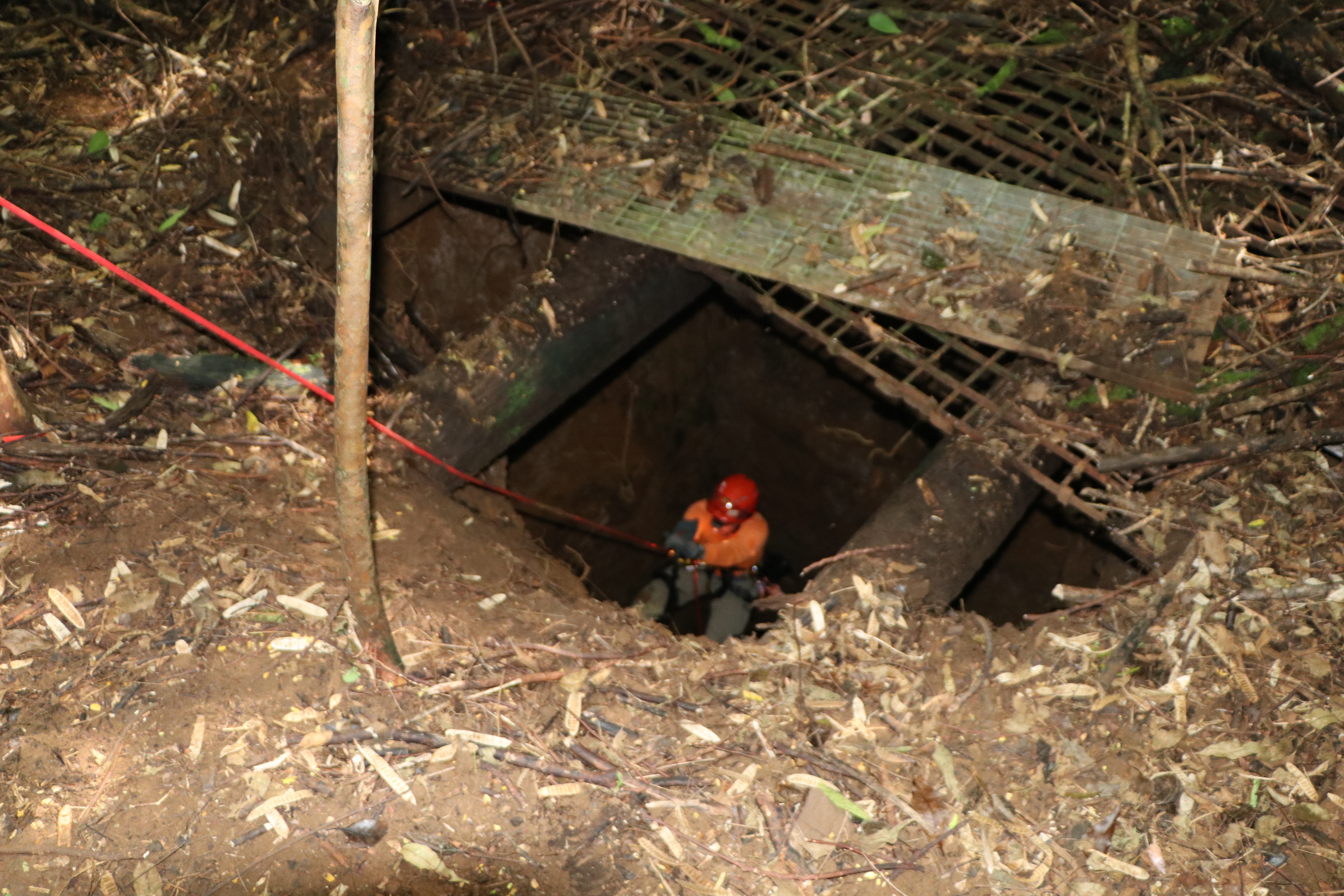 This morning after Mann and Williams surveyed the scene it was decided it would be safe to send Williams, an experienced climber, into the hole to rescue Orange. With a half dozen people watching from above, Williams rigged his climbing gear, tied off to a stout Guava tree and began lowering himself down. For safety, he carried a radio and air monitoring device to the bottom with him.