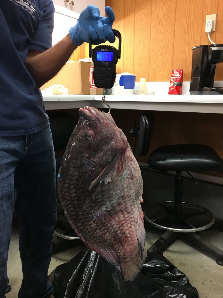 (Hilo) – Aquatic Biologist Troy Sakihara is dealing with tilapia a lot these days. After he was featured in news reports about an invasion of Nile tilapia in the Wailoa and Waiakea waterways on Hawai‘i Island, a local man brought his recently deceased tilapia to Sakihara. It was a whopper, to say the least. Weighing in at a hefty 16 pounds and 62 centimeters long, Sakihara says it’s the biggest of this species of fish he’s ever encountered.