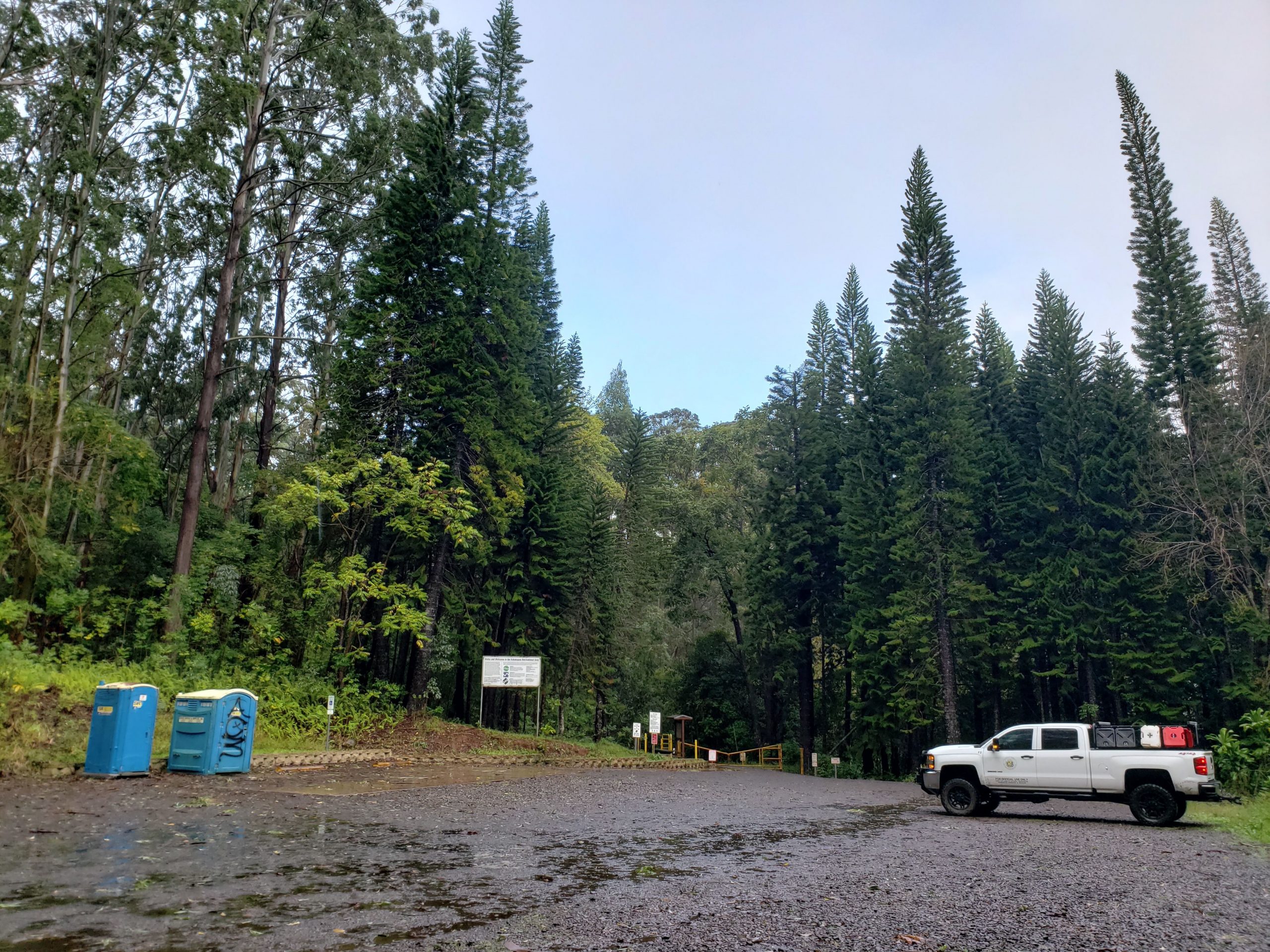 A supplemental hazardous tree removal project will also take place in the area, just to the south in the Waihou Springs State Forest Reserve. This involves the removal of approximately 30 pine and eucalyptus trees. These trees are located within the forest reserve and located near both Olinda and Piiholo roads. DOFAW plans to contract and complete this project by late spring 2020 to avoid the bat pupping season which occurs from June 1 to September 15.