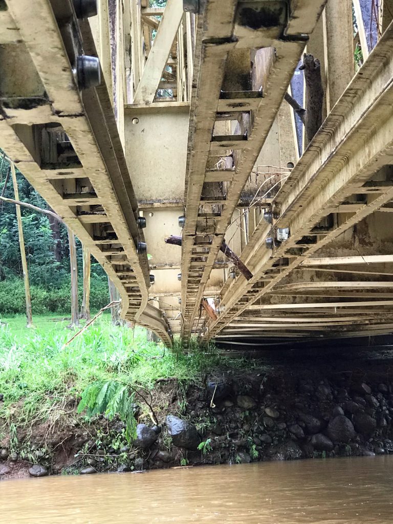 (Lihu’e) – Last weekend a high level of rainfall was recorded across the island of Kaua’i. The USGS South Fork Wailua Stream gage recorded an increase from 5 feet to 20 feet high of water on Saturday. This heavy rain event caused severe damage to the Keahua bridge at the entrance to the Līhu‘e-Kōloa Forest Reserve.