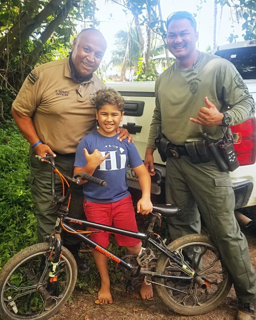 (Honolulu) – Being out of work and out of school coupled with the barrage of COVID-19 crisis news can be particularly tough on families with children. The recovery of Makai Prejean’s bike by a trio of DOCARE officers yesterday could not have come at a better time.