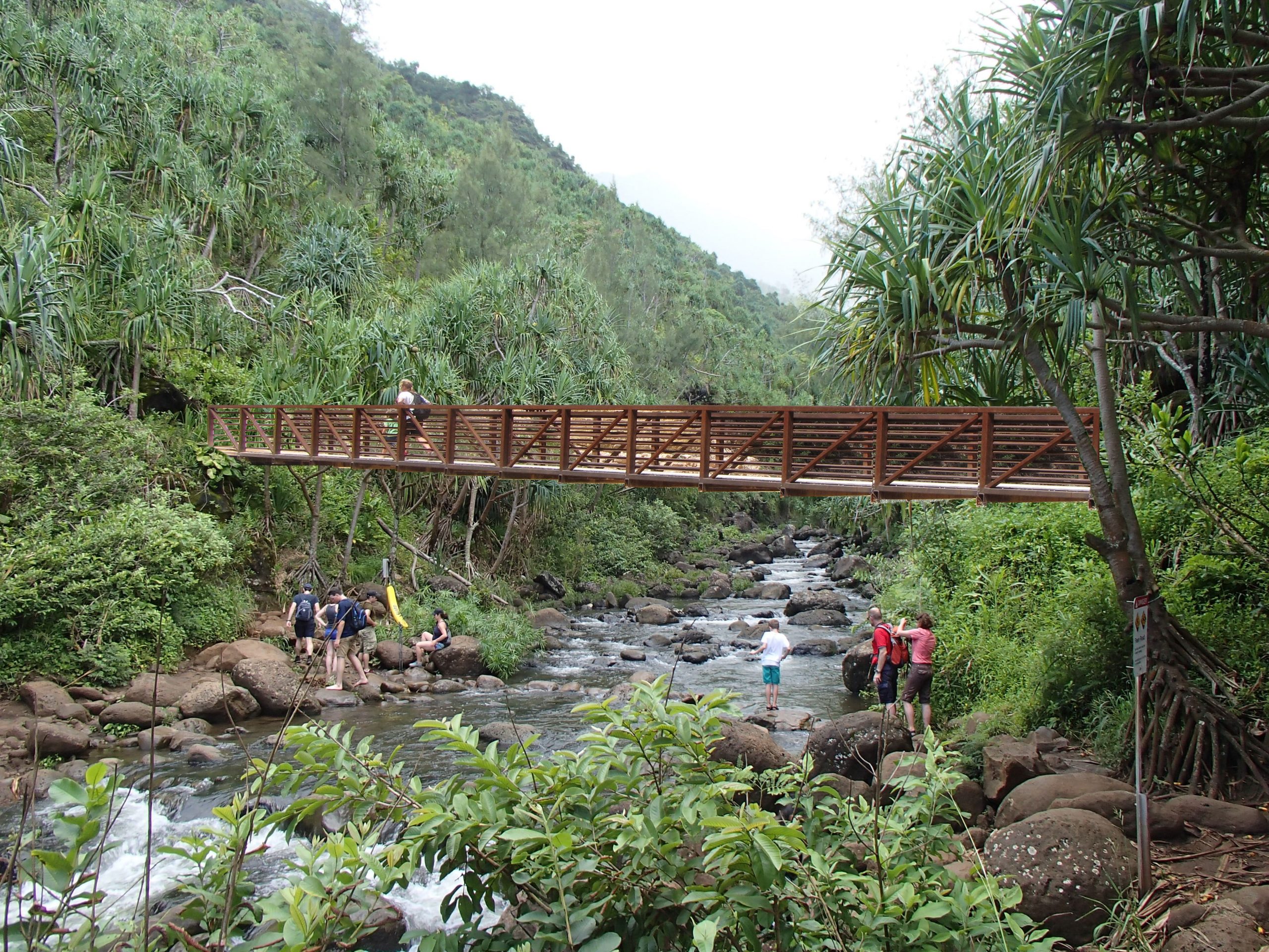 While the new management policy at Hā’ena State Park has successfully reduced daily visitor numbers (and increased the ratio of locals to visitors accessing the trail), and additional management measures installed for Hanakāpīʻai along with an increase in park staffing have also enhanced public safety, the hazard has not been eliminated. The Hanakāpī’ai Bridge Project is a well-vetted effort to create a modern safety feature integrated into a natural and cultural environment. The bridge is intended to safely remove people from Hanakāpī’ai during flash flooding episodes, not to bring more people there.