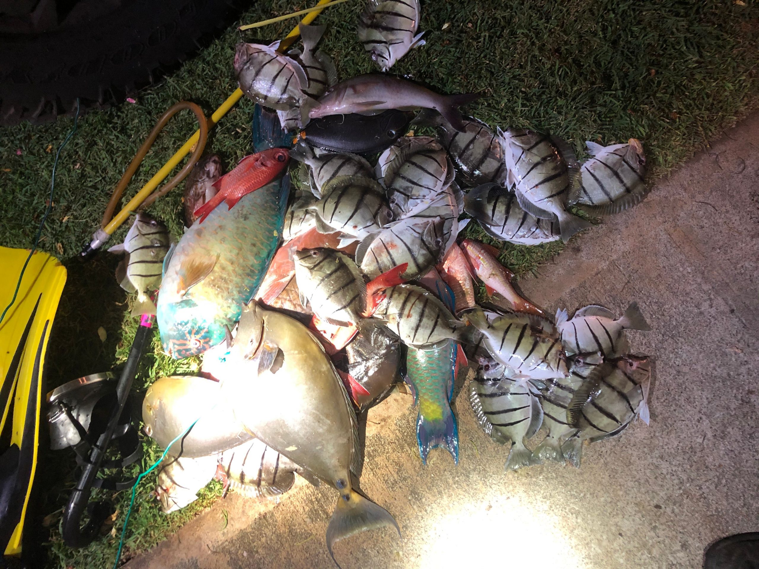 When the first group of two divers came to shore, officers found they were in possession of spears, goggles, fins and a long string of approximately 50 fish. While conducting their investigation, DOCARE officers report the second group of six divers came to shore and were contacted. One of them attempted to conceal his spear in the reef, but it was recovered. This group had approximately 100 fish in their possession.