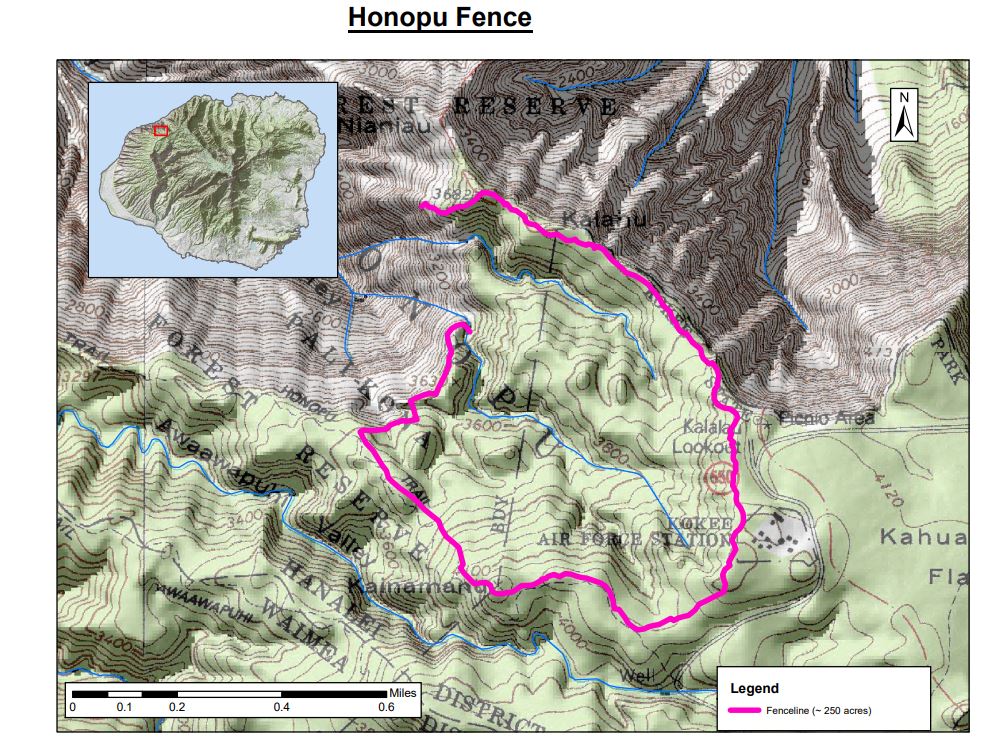 (LIHU‘E) –The DLNR Division of Forestry and Wildlife (DOFAW) will soon begin constructing a fence in the upper Honopū Valley. The purpose of this fence is to remove hooved animals that are damaging federally listed threatened and endangered plants and seabirds occurring in this forested area. The fence will contain step-through gates to allow public access into fenced areas. The attached map outlines the approximate location of the 250-acre fence. Construction will be ongoing due to weather and varying field conditions but is expected to begin in October 2020 and be completed by March 2021.