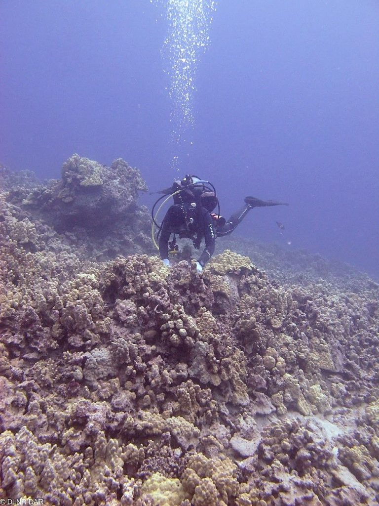 (Kailua-Kona) – On November 6, 2020 DLNR Division of Aquatic Resources (DAR) staff on Hawai’i Island responded to a report of numerous live coral fragments scattered below the base of a popular manta dive site mooring at Makakō Bay (Garden Eel Cove) in North Kona. DAR Kona staff documented numerous broken coral colonies along the mooring line and approximately 150 broken coral fragments in the sand at the base of the mooring. The definitive cause of the damage could not be determined and likely occurred more than two weeks prior to the report.