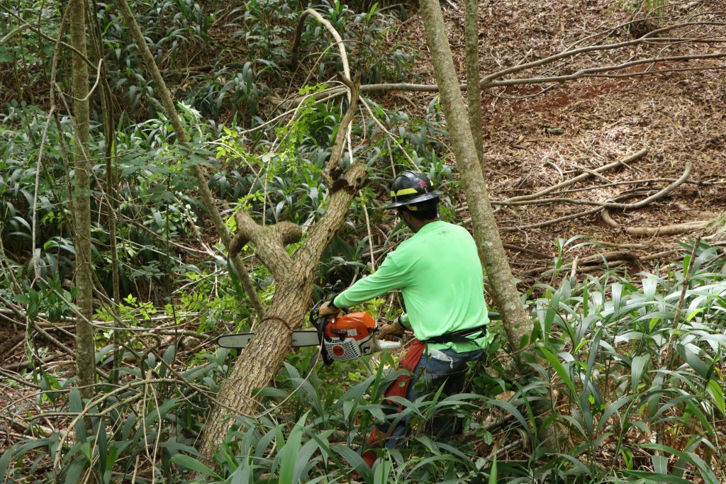 The environmental damage caused by illegal trails is heartbreaking to lovers of native plants and trees. Kaina Ryan, another DOFAW forestry worker, pointed out some of the damage during a recent trail restoration workday. “So, here’s a nice young ʻōhiʻa that is still alive. Most of them are pretty much either dead or down on the ground already. And on this side, we have the native pilo. There’s koa and maile too. I would say these are the main ones that are destroyed during the making of all these illegal bike trails,” Ryan observed.