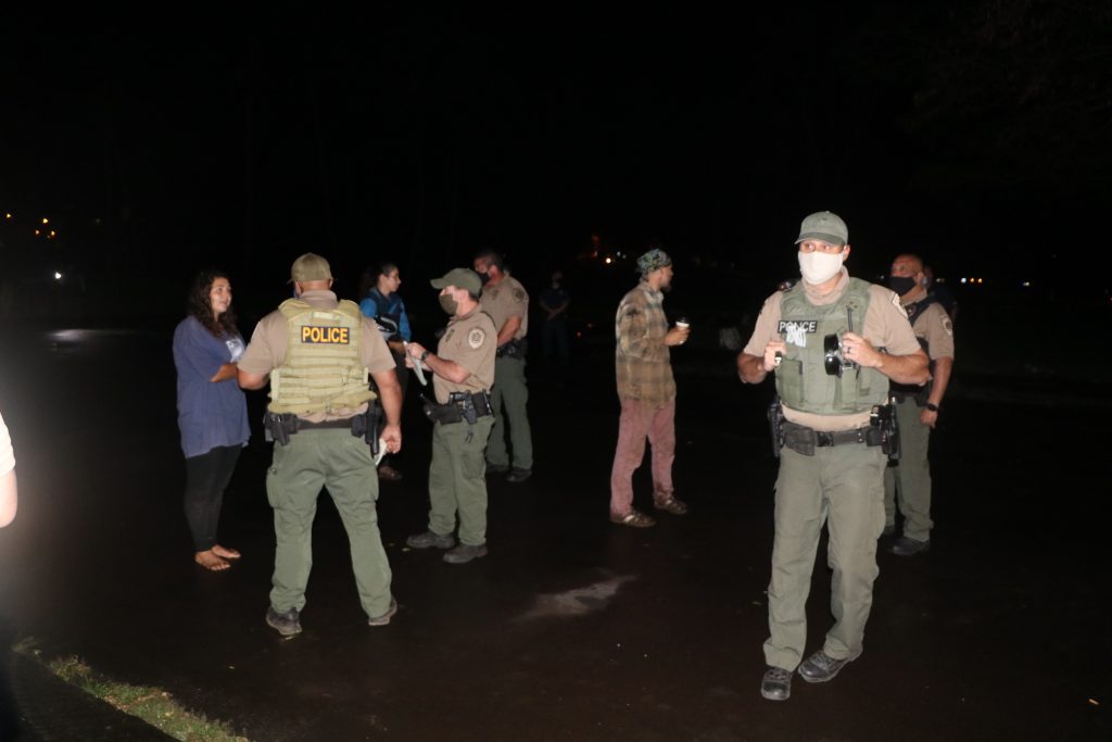 DOCARE officers also removed aKanaka Gardensign that detailed the groups claims of ownership of the property as well as several flags that had been erected at the parks main entrance. Several occupiers stood with flags in hand as trucks carrying the plants away, passed them. A couple of tents that had been put up earlier in the week were previously taken down by their owners. Officers from the Hawaii Police Department and the Dept. of Public Safety Sheriff Division provided support for the operation.