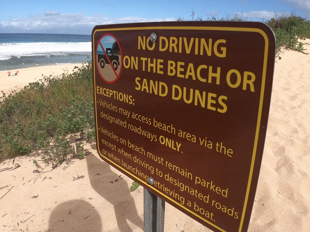 In addition to being Illegal, if you’re racing across dunes or up and down the sand, it becomes a safety issue for other people on the beach. Sensitive plants on the beach have been destroyed. After being forced to close the park for much of 2020, the DLNR Division of State Parks erected new signs to better define where it is okay to drive.