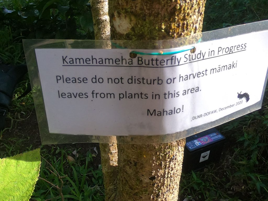 Several times each week, entomologist Will Haines, with the DLNR Division of Forestry and Wildlife and Kupu member, Jana Maravi, hike into this protected restoration area to place the caterpillars of the Kamehameha butterfly onto native māmaki plants, their most common food source. They have remote cameras set up in the trees hooked to digital video recorders, as they attempt to find out why the caterpillars are disappearing.