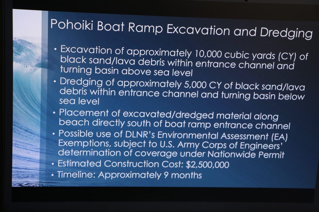 Finn McCall, engineer for the DLNR Division of Boating and Ocean Recreation (DOBOR) presented three options for reopening the ramp. The fastest is also the least costly, though less permanent.