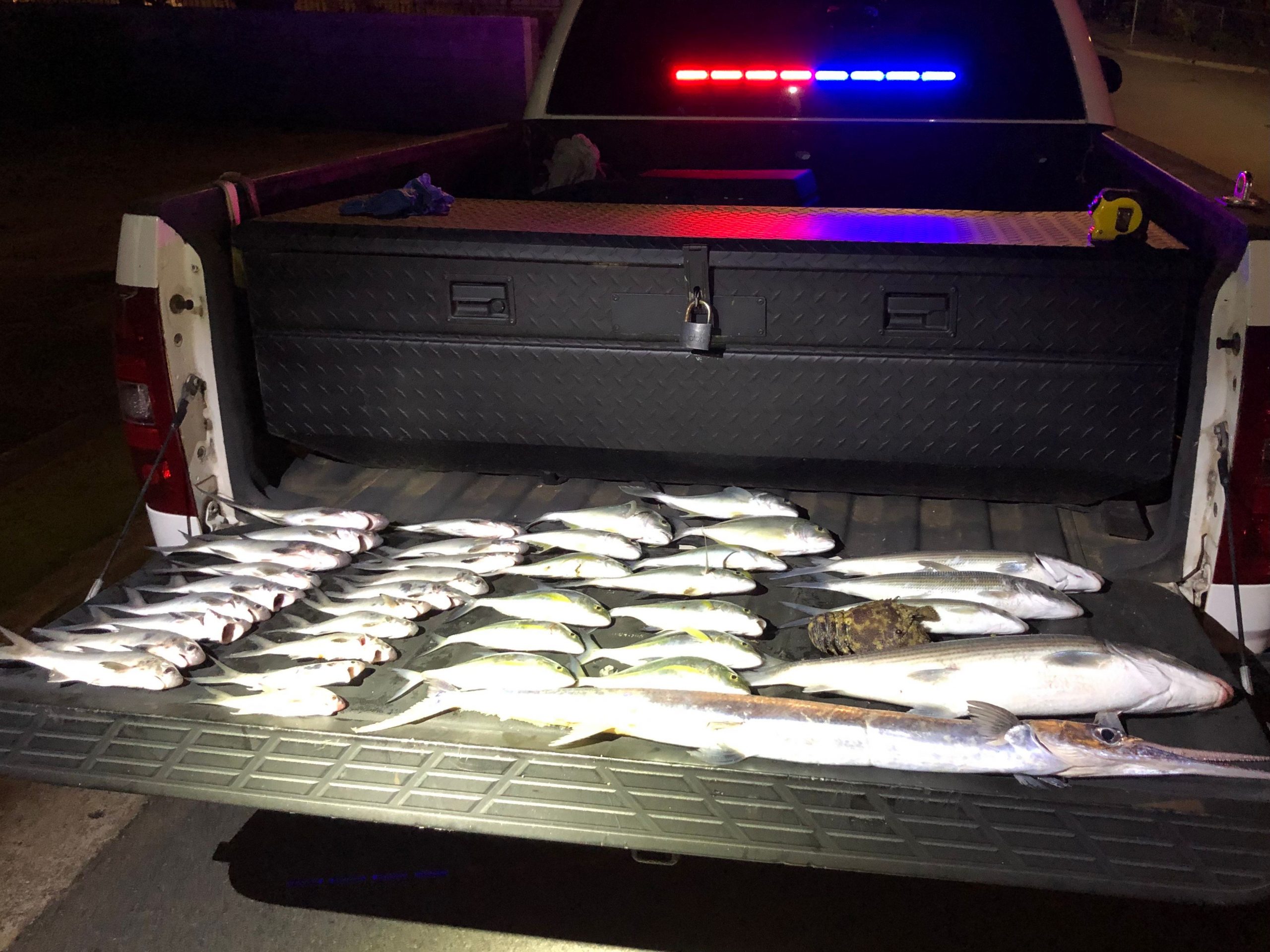 They are charged with possession of multiple species of undersized aquatic life, including Moi, Papio and Ō’io. They were also had an out-of-season lobster that was returned to the water. Along with the nets and other gear, the dead fish were photographed for evidence. Several pieces of non- regulated species were also taken. It is illegal to lay nets on Oahu South Shore from Kawaihoa Point to Keahi Point.