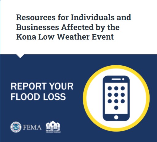 DLNR Engineering’s Wai Halana website has up-to-date information on Floodplain management and Flood Insurance in the state. Clicking on the blog, “Resources for Individuals and Business Affected by the Kona Low Weather Event” provides information on reporting damages to your county officials, information on how to file a flood claim, and other mitigation resources.