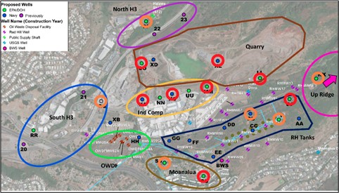 In discussion with stakeholders, including CWRM, DOH, EPA, Navy, Honolulu Board of Water Supply, and U.S. Geological Survey, through the Aquifer Recovery Focus Group, eight additional priority monitoring well locations have also been identified and the Regulatory Agencies are supporting the Navy’s effort to work with landowners to site new sentinel monitoring wells between the Red Hill facility and nearby public water supplies. These wells will also need to be permitted by CWRM and are shown circled in red below.