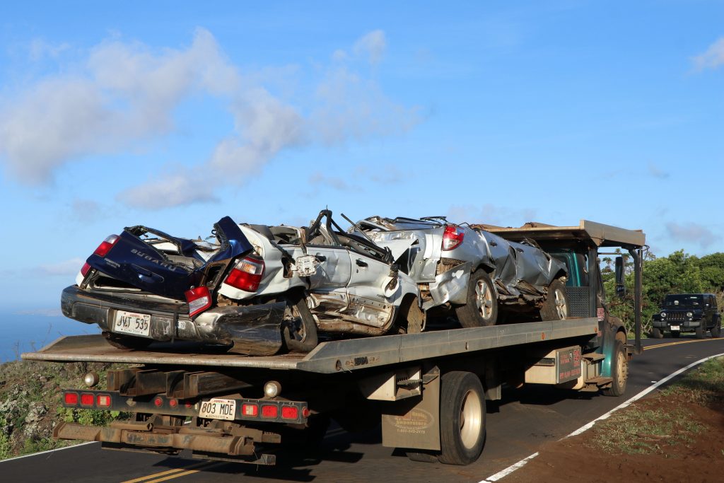 This morning, two flatbed tow trucks hauled seven vehicles down the long and winding road, after they’d been towed to the paved highway several miles beyond Ulupalakua Ranch. It’s the same trip the tow operators will make dozens of times until all of the vehicles are removed and transported to a salvage yard.