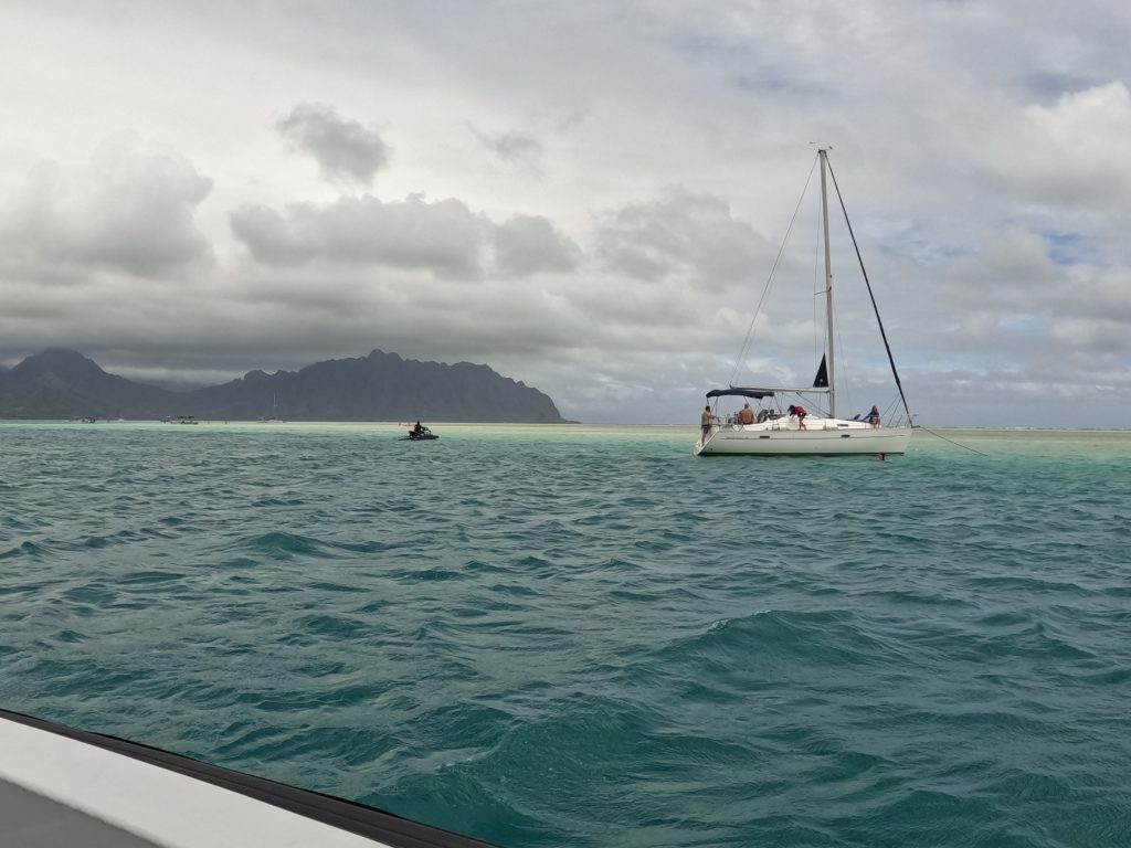 (He’eia Kea Small Boat Harbor, Windward O‘ahu) – White caps in Kāneʻohe Bay, strong winds, and cloudy skies are contributing to a quieter than normal holiday weekend at Ahu o Laka. For the past decade, alcohol has been prohibited at the popular sandbar for the three-day-weekends of Memorial Day, Independence Day, and Labor Day.