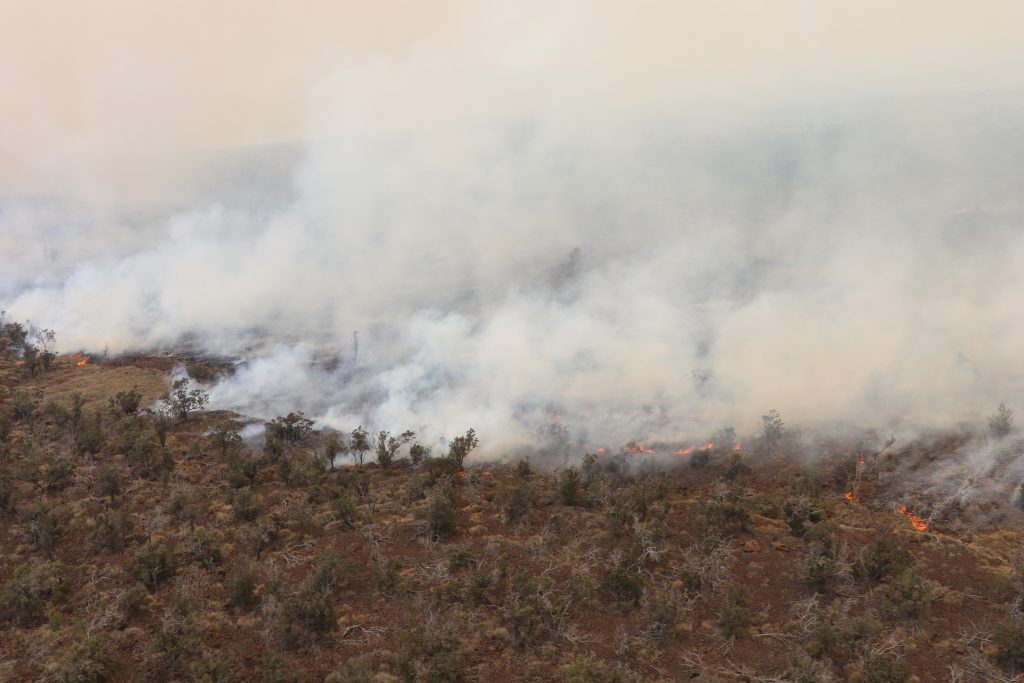 So far, the fire is burning mostly in invasive fountain grass. It is not currently endangering any private property or homes and eventually may be contained by lava flows.