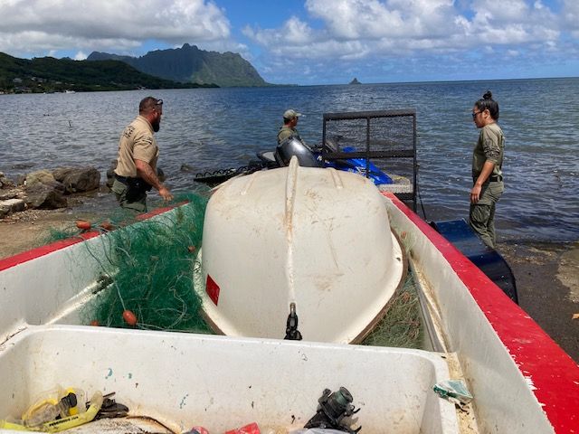 When the boats came ashore near Kahalu‘u, officers contacted Estocado, cited him and confiscated both vessels and the net as evidence. They say “a lot” of fish were caught up in the net. Estocado was given a date of Nov. 3, 2022, to appear in Kāneʻohe District Court.