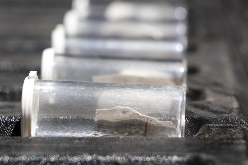 Any male mosquitoes caught by the team in fine mesh bags are aspirated into test tubes that will be sent off to labs for testing. Foster commented, “It’s hard to get into the high-elevation sites, so we’re doing our trial runs down low to figure out what the best traps and lures are for increasing our chances of catching male mosquitoes.”