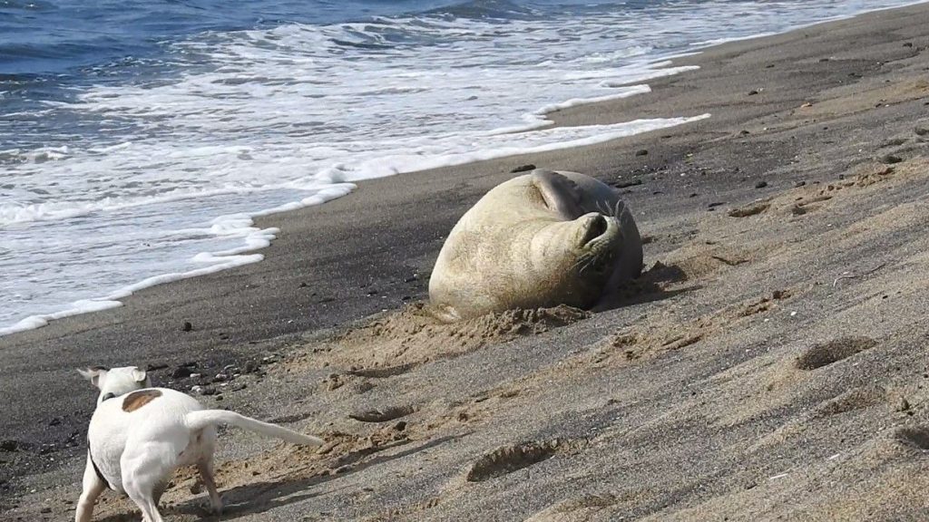 The law enforcement agencies caution that resting monk seals are powerful animals and could easily hurt or kill an off-leash dog. “Not to mention,” DOCARE Chief Jason Redulla commented, “monk seals are protected by a multitude of state and federal laws, as this individual learned.”
