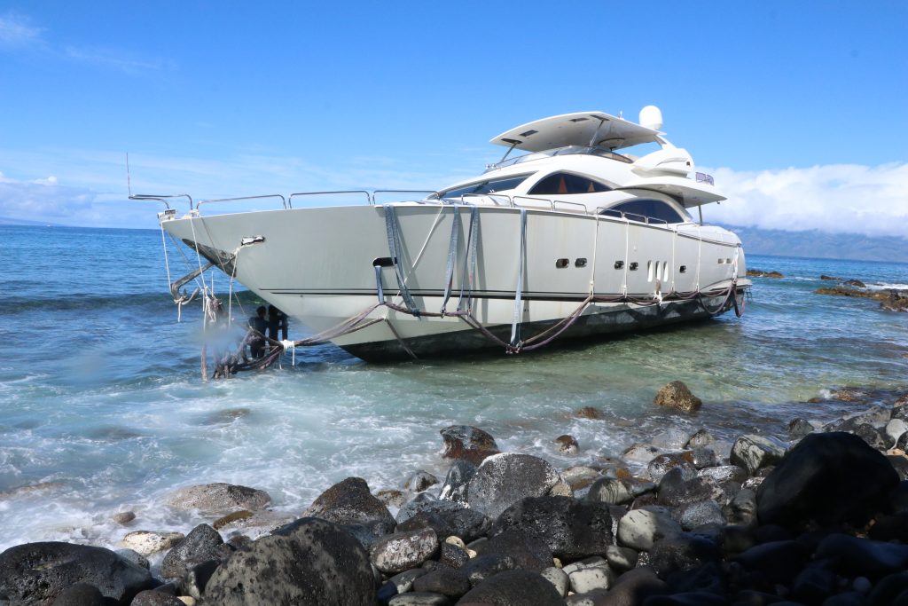 (HONOLUA BAY, MAUI) – The salvage ship, Kahi, operated by Visionary Marine LLC and a tractor tug, the Mary Catherine operated by Sause Brothers Inc., both of Honolulu are stationed just outside the Honolua-Mokulē’ia Marine Life Conservation District, today preparing to try and pull the luxury yacht Nakoa off nearshore rocks.
