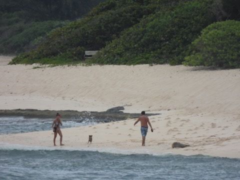 ANONYMOUS TIP SHOWS COUPLE AND LOOSE DOG CLOSE TO RESTING MONK SEAL
