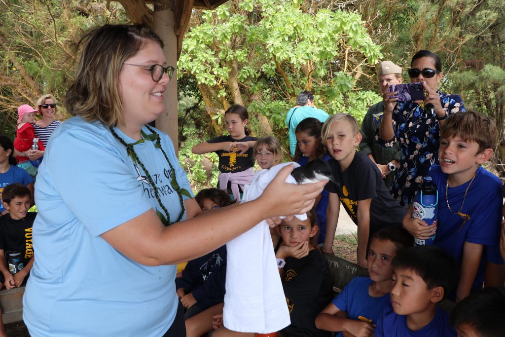 After leading the keiki in a chant, kumu Sabra Kauka was the first to cradle one of the small seabirds in her hands and then moments later from a platform, perched on the edge of the shoreline, released it. After each of the three open ocean flights the students clapped and cheered.