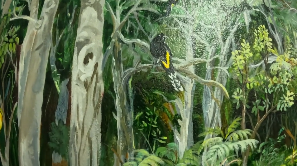 She and the cameras then moved into the library which features the second part of the mural. It’s dedicated to the native Hawaiian crow (ʻAlalā), which viewers will see in real life, once the shades are raised. In addition to ecological education, the virtual field trip also addresses the importance of forest birds and culture.