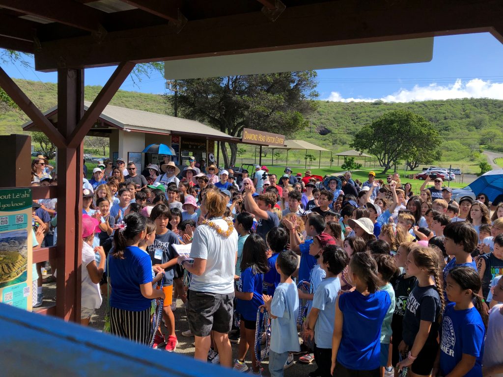 More than one hundred students and their teachers hiked the mile from Waikīkī Elementary to Diamond Head to participate in the event. In addition to educational signage, QR codes on the signs connect visitors to videos featuring students and experts to learn more.