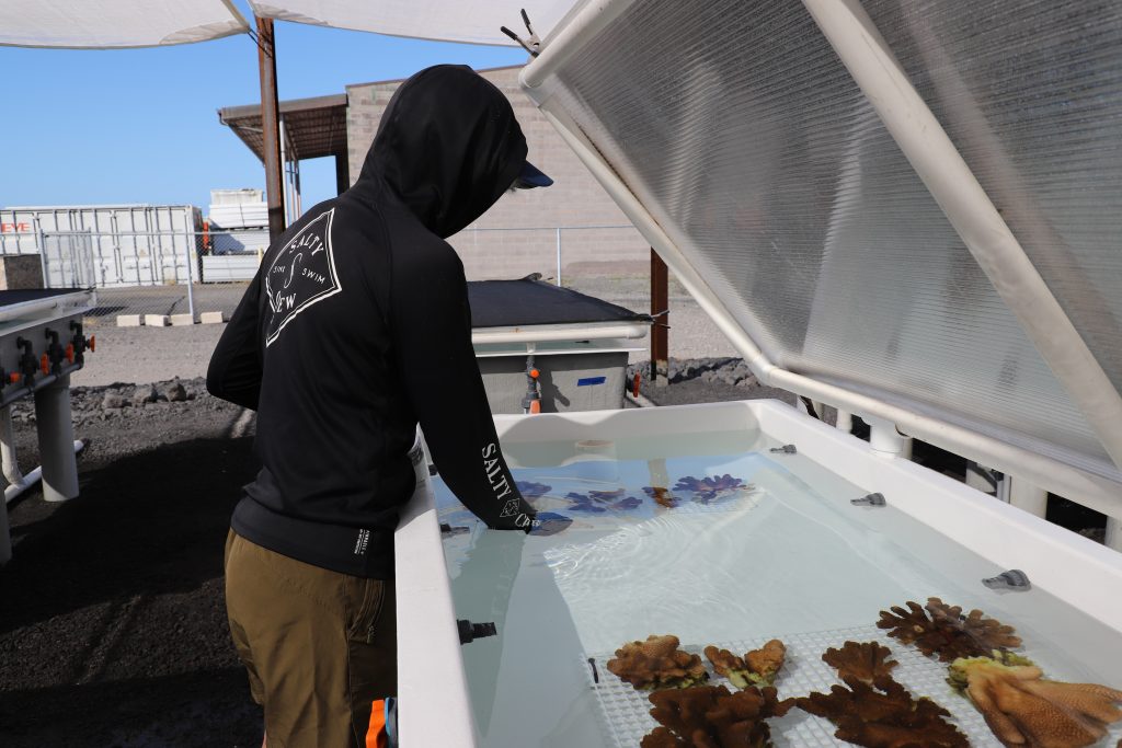 At the nursery, Sydney Lewis, a DAR coral restoration technician, cleans a tank (raceway) housing some of the rescued corals. There are 72 raceways in all, representing the number of culturally important watersheds (ahupuaʻa) in West Hawai‘i.
