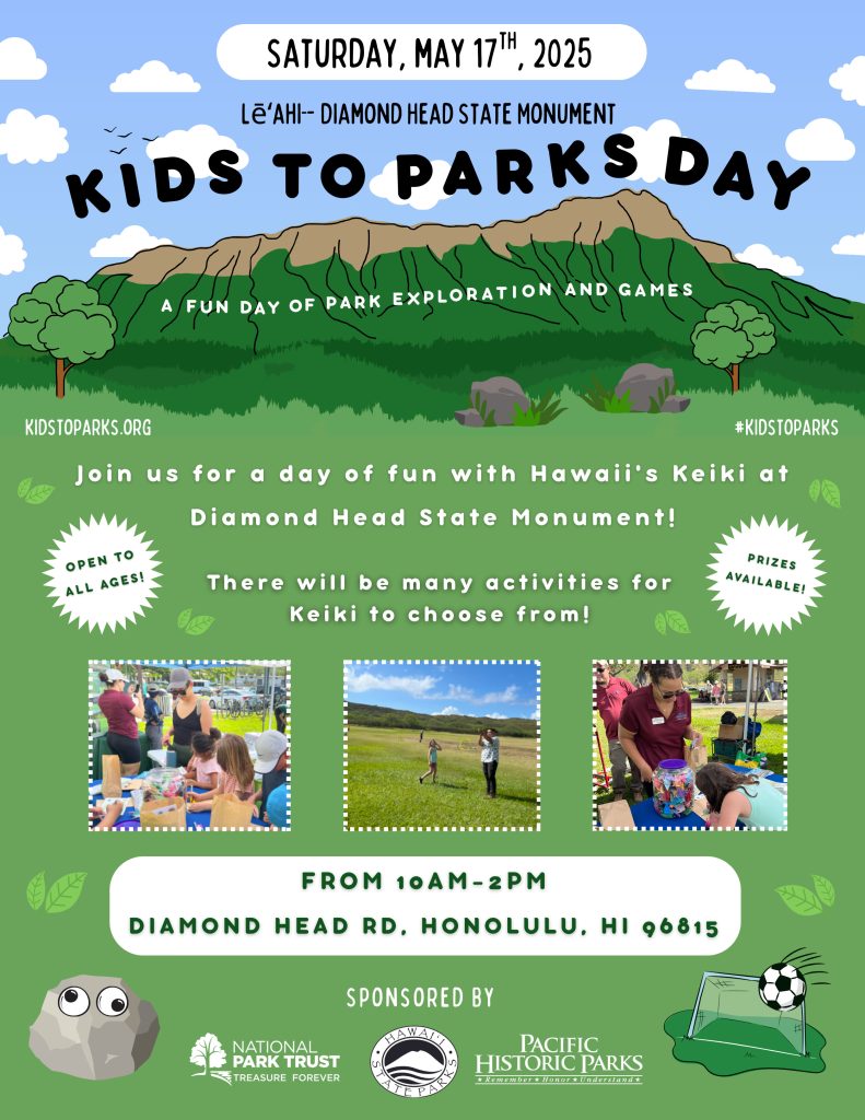“DSP, in partnership with Pacific Historic Parks and the National Park Trust, is thrilled to invite families to celebrate Kids to Parks Day again this year. This nationwide event aims to ignite a love of the outdoors in children, fostering a deep appreciation for our public lands and inspiring the next generation of park enthusiasts and conservationists,” noted Curt Cottrell, DSP administrator. “We look forward to welcoming families to Diamond Head and creating lasting memories while cultivating a sense of responsibility for our shared natural heritage.”