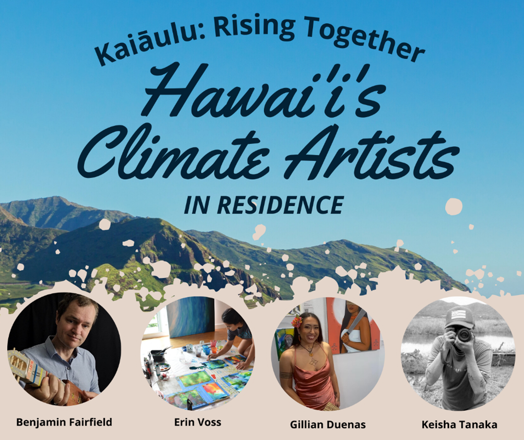 The featured artists were selected for the Climate Artist-in-Residence program by the Hawaiʻi State Climate Change Mitigation and Adaptation Commission (CCMAC). Artists-in-Residence spend a year immersed in topics including land stewardship, energy efficiency, cultural knowledge and community resilience. They mentor students through creative art and work with various media such as paint, music, textiles and photography.