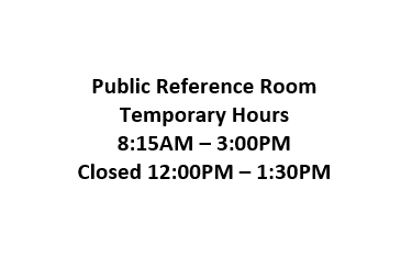 Please be aware that Public Reference Room hours could change on short notice due to staffing shortages. This will include some lunch hour closures. We thank you in advance for ...