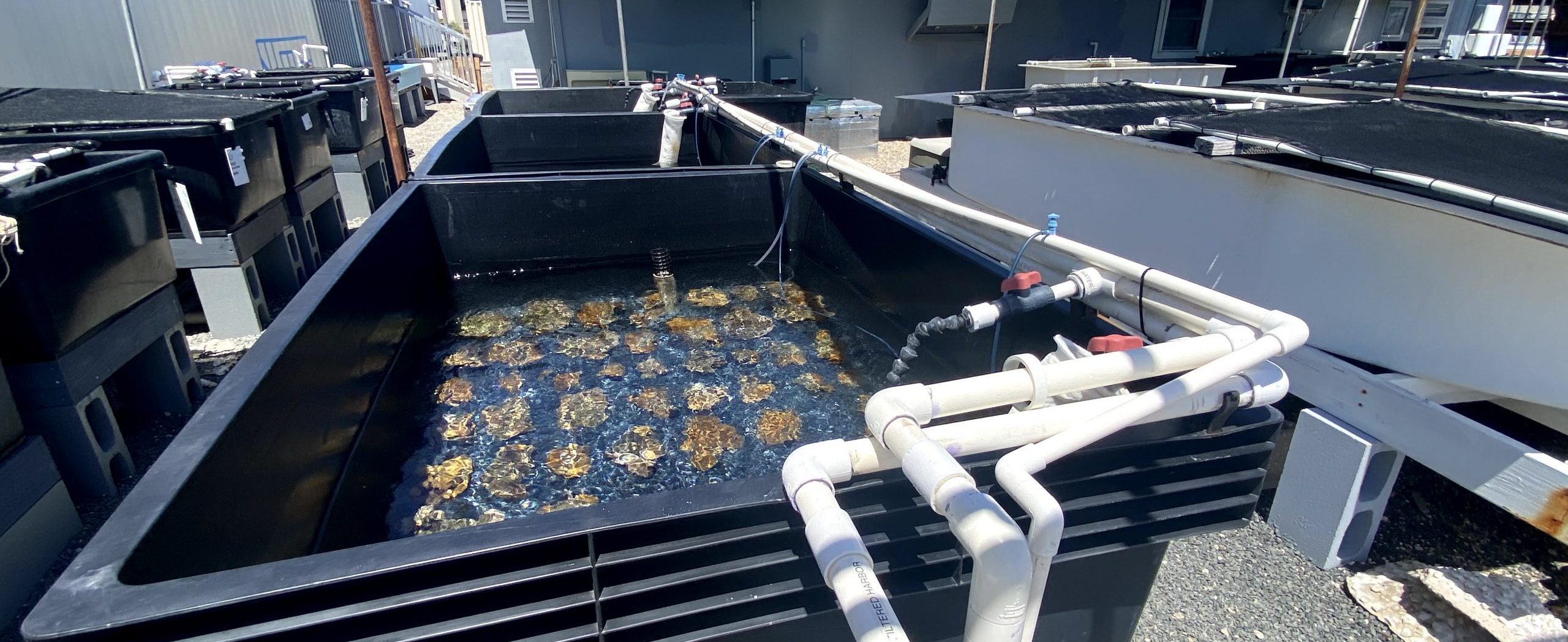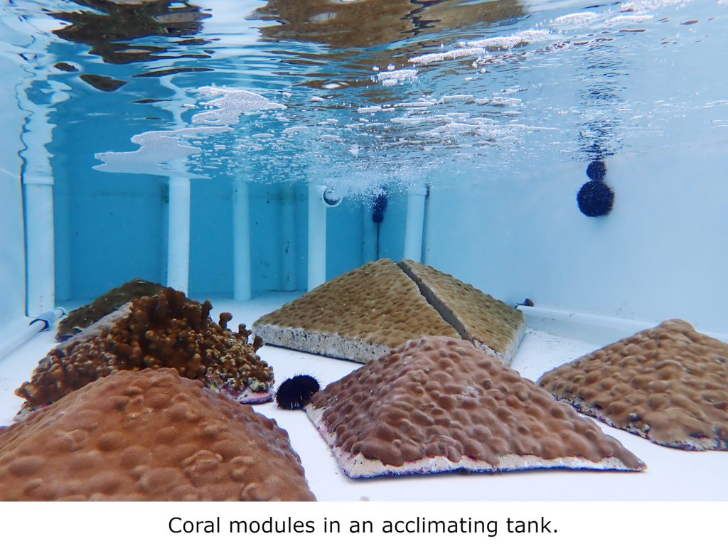 Once the concrete module is completely covered in coral tissue, it is almost ready to be outplanted onto a natural reef. The fast-growth environment at the HCRN is very different from the natural reef environment, so colonies are acclimated to the specific conditions found at the target restoration site. Coral outplants are re-introduced to natural sunlight, photoperiod, water quality parameters, and restoration site temperatures in outdoor acclimation tanks for at least 30 days before they are ready for life in the ocean. The entire process is photo documented and entered into the HCRN database to maintain a chain-of-custody for every coral module grown at the HCRN.